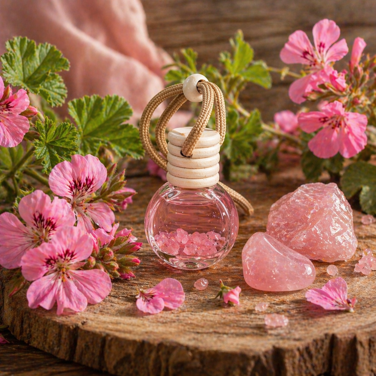 Květinové geranium rose přináší harmonii, zklidňuje emoce a podporuje pocit ženskosti a jemnosti. Jeho vyvážená vůně působí uklidňujícím i lehce povzbuzujícím dojmem. Růženín uvnitř difuzéru je kamenem lásky, něhy a vnitřního klidu. Podporuje sebelásku, empatii a harmonii v mezilidských vztazích.