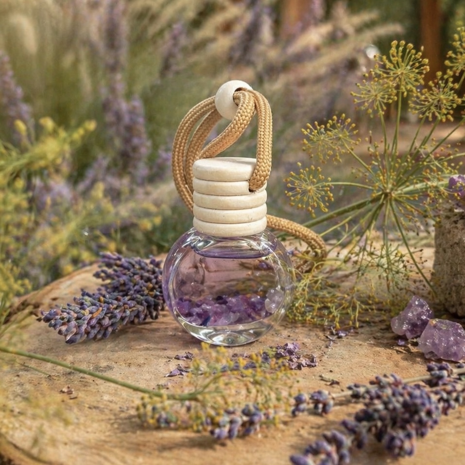 Hřejivý fenykl přináší pocit stability, harmonizuje a jemně povzbuzuje. Ametyst uvnitř difuzéru je kámen klidu a rovnováhy. Pomáhá navodit vnitřní harmonii a podporuje relaxaci.