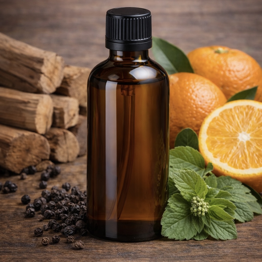 Základem je vzácné santalové dřevo, které svou sametově dřevitou vůní navozuje pocit klidu a uzemnění. Černý pepř přidává jemné zahřátí a podporuje prokrvení, zatímco mandarinka vnáší lehkost a svěží energii. Směs je rozpuštěná v lehkém hroznovém oleji, který pokožku intenzivně vyživuje bez pocitu mastnoty.